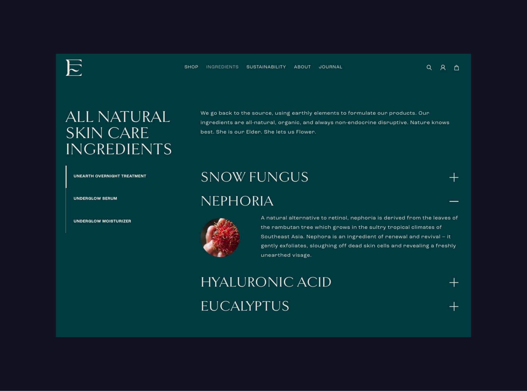 To showcase all of the beneficial, organic ingredients used to produce the products, we implemented an ingredients glossary, complete with visuals and details on each ingredient, classified by product. Product-specific ingredients were also hooked to individual product detail pages.